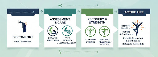 Unlike passive stretching, dynamic stretching under professional guidance creates genuine neurological change. Your nervous system experiences that full range of motion is safe during athletic demands. Your muscles learn to lengthen without triggering protective tension. The result is mobility restoration that supports athletic performance, not just basic function.