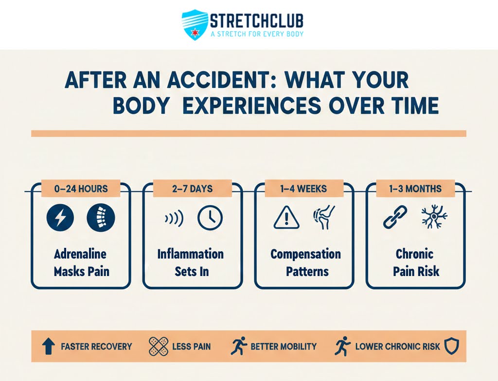 Our stretching protocols reduce stress by improving blood and oxygen flow throughout your body, supporting mental clarity and emotional well-being during recovery. Regular chiropractic care and stretching also prevent future injuries by maintaining proper alignment and flexibility. At StretchClub, we’re not just treating your accident injuries—we’re helping you achieve total health and wellness that keeps you injury-free for years to come.