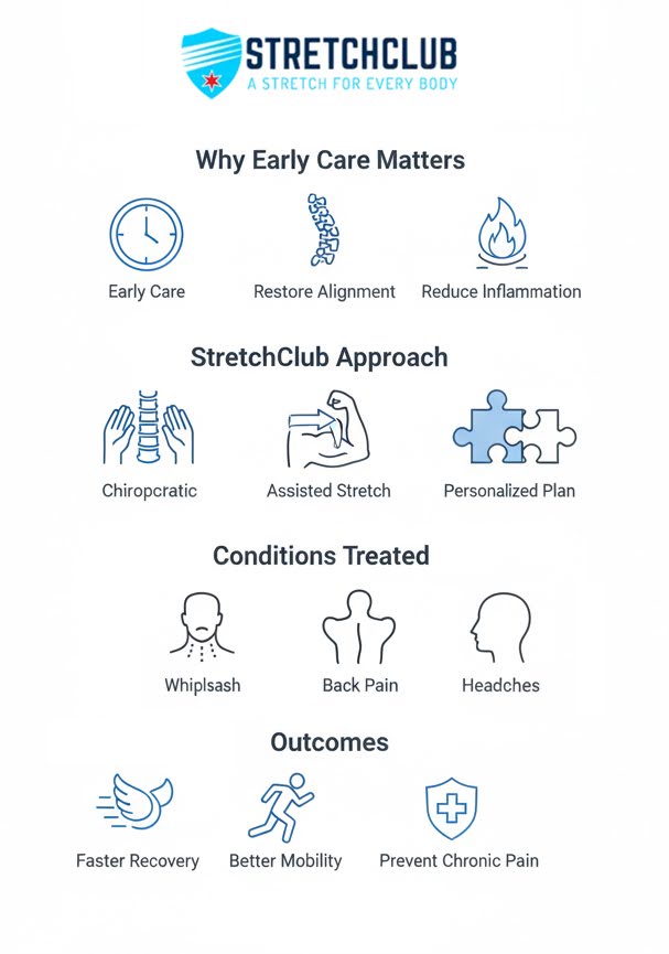 Research shows that prompt chiropractic care after personal injuries leads to faster recovery and better outcomes. Delaying treatment can cause spinal misalignments, nerve irritation, restricted joint mobility, and muscular imbalances to worsen. Early chiropractic adjustments and targeted stretching help restore alignment, reduce inflammation, improve circulation, and prevent long-term pain patterns.