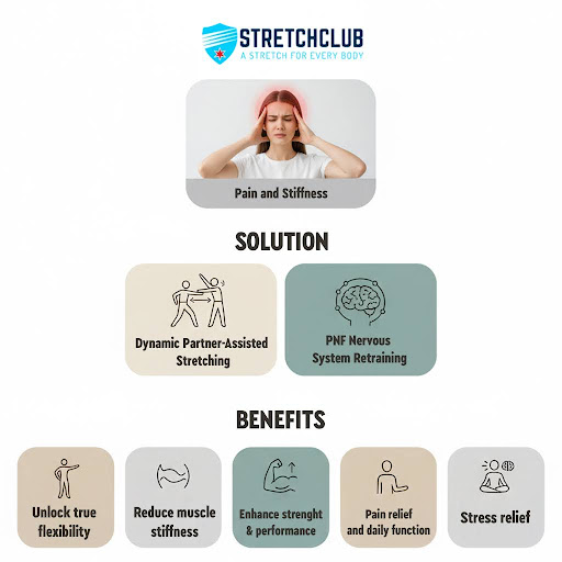 At StretchClub® in Oswego, we use dynamic partner-assisted stretching and PNF techniques to unlock genuine flexibility, improve movement quality, and enhance performance. By addressing both muscle tightness and underlying nervous system restrictions, we create lasting results that truly improve how your body moves.